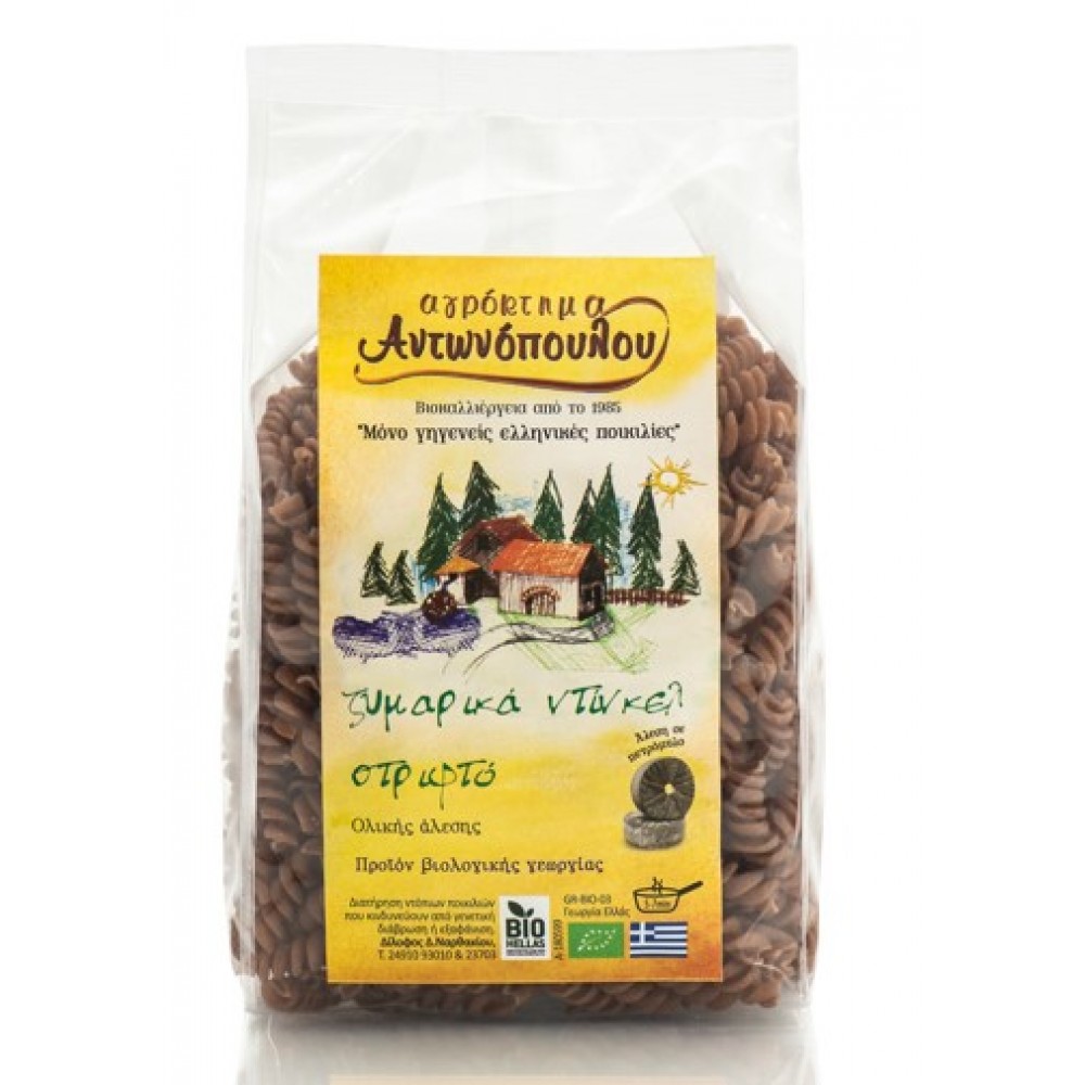 Στριφτό βιολογικής γεωργίας από το 100% ντίνκελ ολικής άλεσης τη γηγενή ποικιλία βιολογικής γεωργίας του αγροκτήματος Αντωνόπουλου. Κατάλληλο για vegan και χορτοφάγους Ζυμαρικά πλούσια πηγή μαγνησίου, φωσφόρου, σεληνίου και ψευδαργύρου, καλή πηγή λυσίνης, πλούσια πηγή πρωτεΐνης.