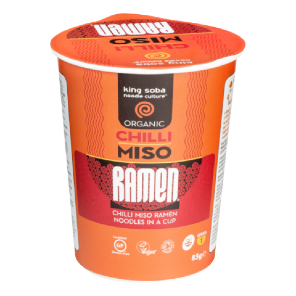 Βιολογική Σούπα Miso με λεπτά Νουντλς καστανου ρυζιού και Τσιλι, χωρίς Γλουτενη Vegan 85gr King Soba