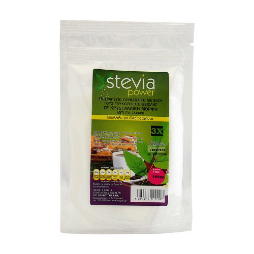 Στέβια σκόνη σε σακουλάκι 150γρ. 3 φορές πιο γλυκειά από την ζάχαρη. Η στέβια σε σκόνη χρησιμοποιείται ως εναλλακτική γλυκαντική ουσία από την ζάχαρη. Ιδανική για ροφήματα. Η στέβια σε σκόνη έχει πολλαπλάσια γλυκύτητα από τη ζάχαρη, δεν αποδίδει ενέργεια (θερμίδες) και δεν περιέχει υδατάνθρακες. Η στέβια σε σκόνη μπορεί να συμβάλλει στον έλεγχο του βάρους, αφού μειώνει το θερμιδικό περιεχόμενο της δίαιτας και διατηρεί την ευχαρίστηση στο διαιτολόγιο βοηθώντας τους ανθρώπους να μείνουν πιστοί στη δίαιτά τους για μεγαλύτερο χρονικό διάστημα.