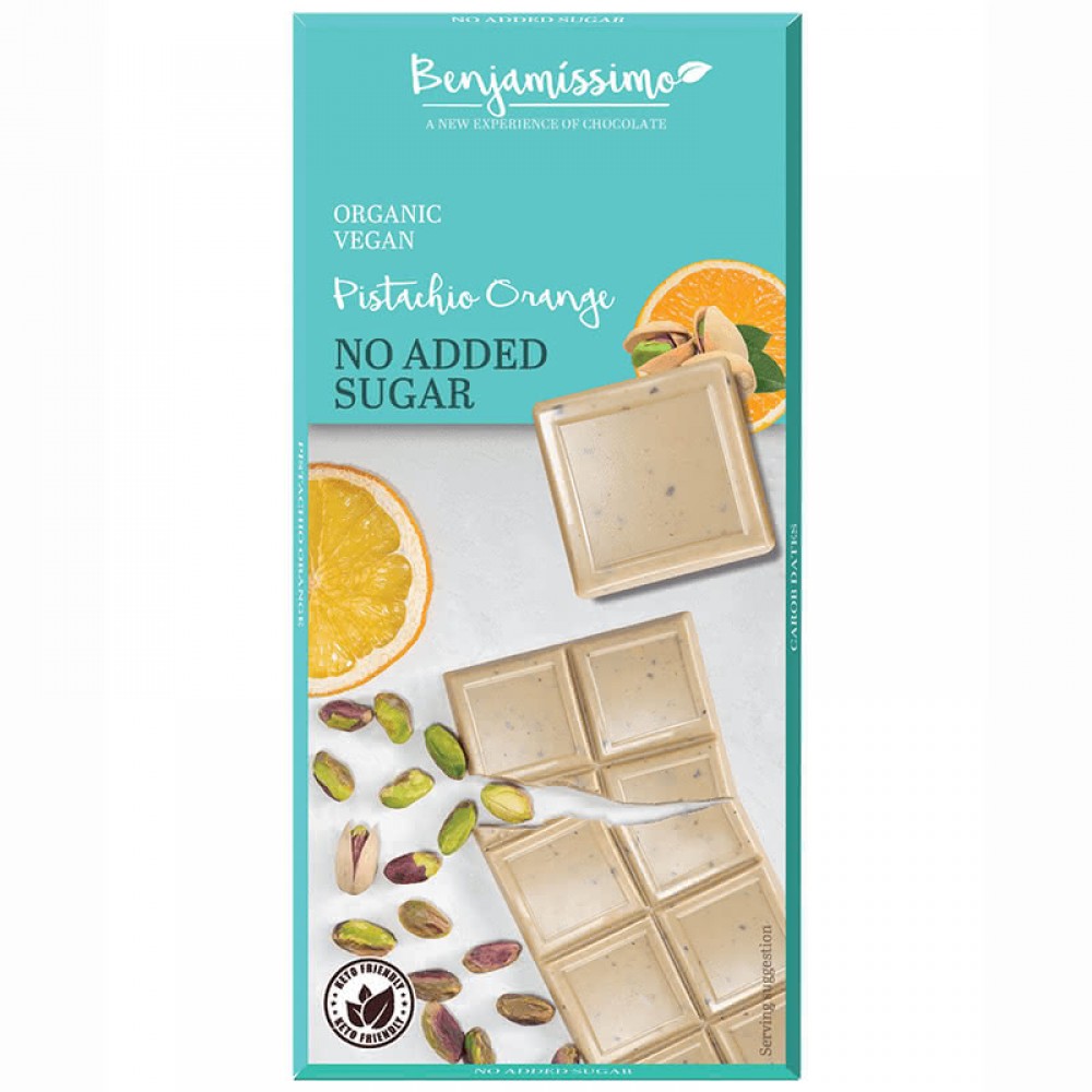 Βιολογική σοκολάτα με φυστίκι Αιγινης και πορτοκάλι χωρίς ζάχαρη και χωρίς Γλουτενη 70gr Benjamissimo