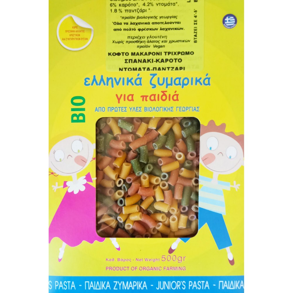 Βιολογικό κοφτό μακαρονάκι Παιδικό τρίχρωμο (Σπανάκι Καρότο Ντομάτα Παντζάρι) χωρίς προσθήκη αλατιού & χρωστικών 400gr ΒΙΟΤΡΟΦΟΣ