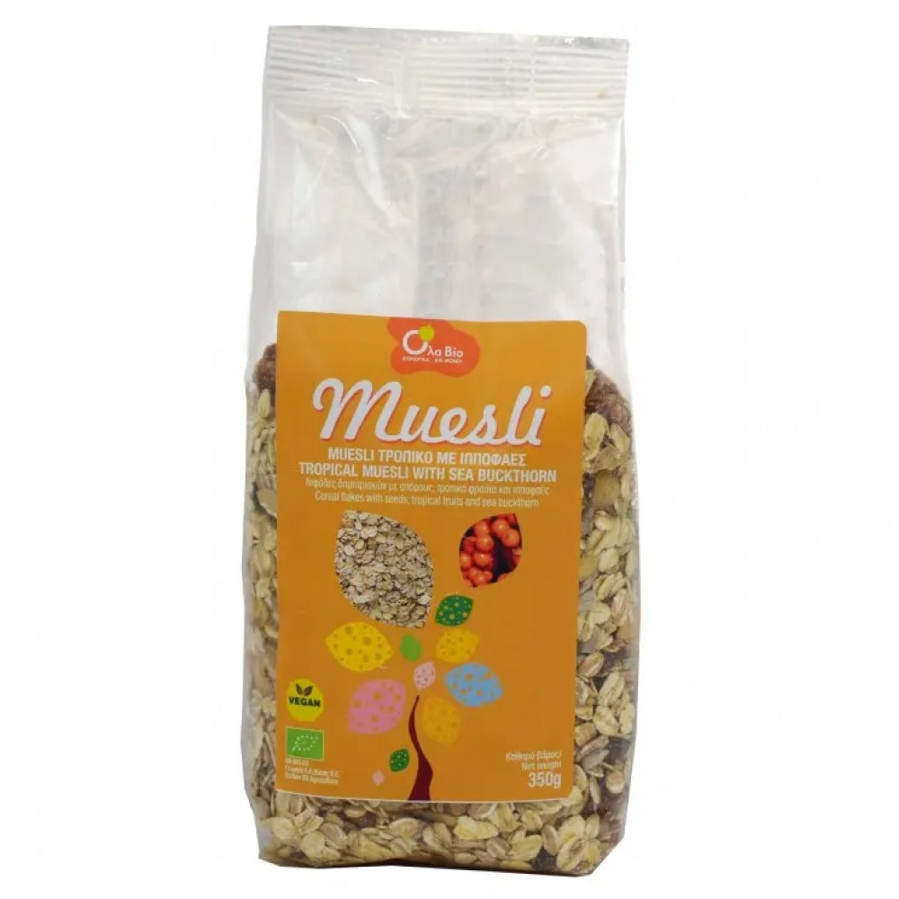 Βιολογικό μούσλι δημητριακών με ξηρούς καρπούς, εξωτικά φρούτα και Ιπποφαές 350gr Ola Bio