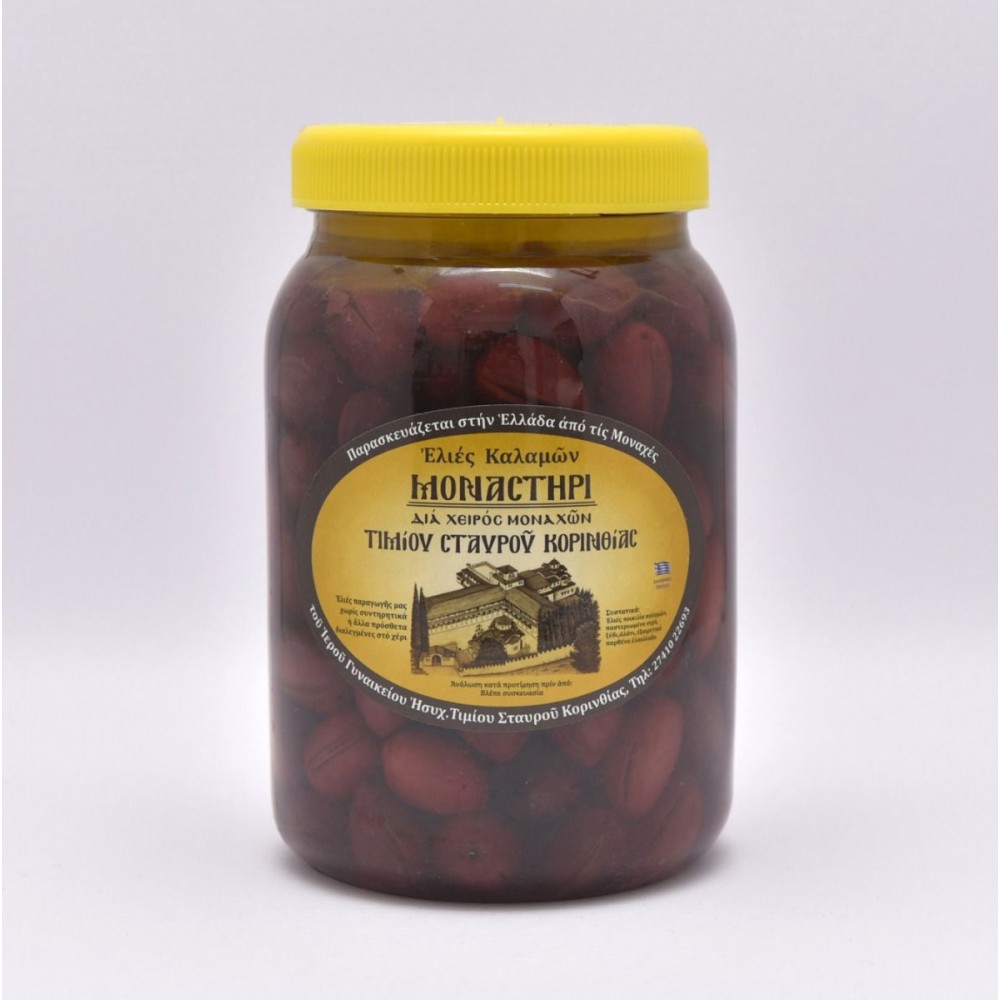 Ελιές Καλαμών, παραγωγή του Μοναστηρίου Κορινθίας, διαλεγμένες και χαρακτές με το χέρι από μοναχές, μέσας σε παστεριωμένη άλμη και εξαιρετικό παρθένο ελαιόλαδο.