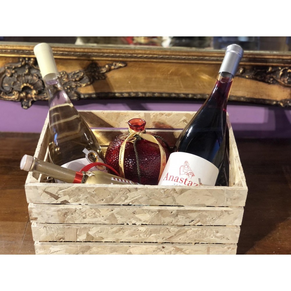 Καλαθάκι Δώρου Ξύλινο με βραβευμένα κρασιά λευκό (Μαλαγουζιά-Chardonnay) κόκκινο (Syrah-Λημνιό), Ρόδι καλοτυχίας και Λικέρ μαστίχα-Κανέλλα