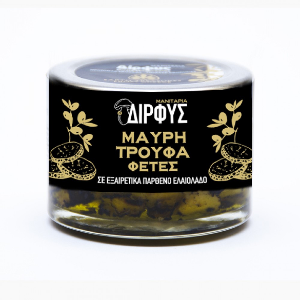 Λεπτές φέτες μαύρης τρούφας (Tuber aestivum) σε έξτρα παρθένο ελληνικό ελαιόλαδο, αλάτι , ελαιόλαδο με άρωμα τρούφας. Δεν περιέχει συντηρητικά . Διατηρείται αναλλοίωτο σε ξηρό περιβάλλον σε θερμοκρασία δωματίου.