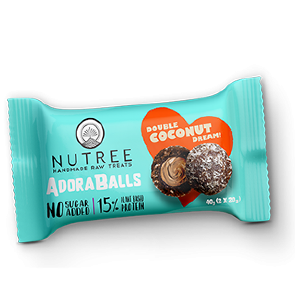 Πρωτεϊνικές μπαλίτσες AdoraΒalls με διπλή κρέμα καρύδας, χωρίς ζάχαρη και χωρίς γλουτένη 40gr Nutree