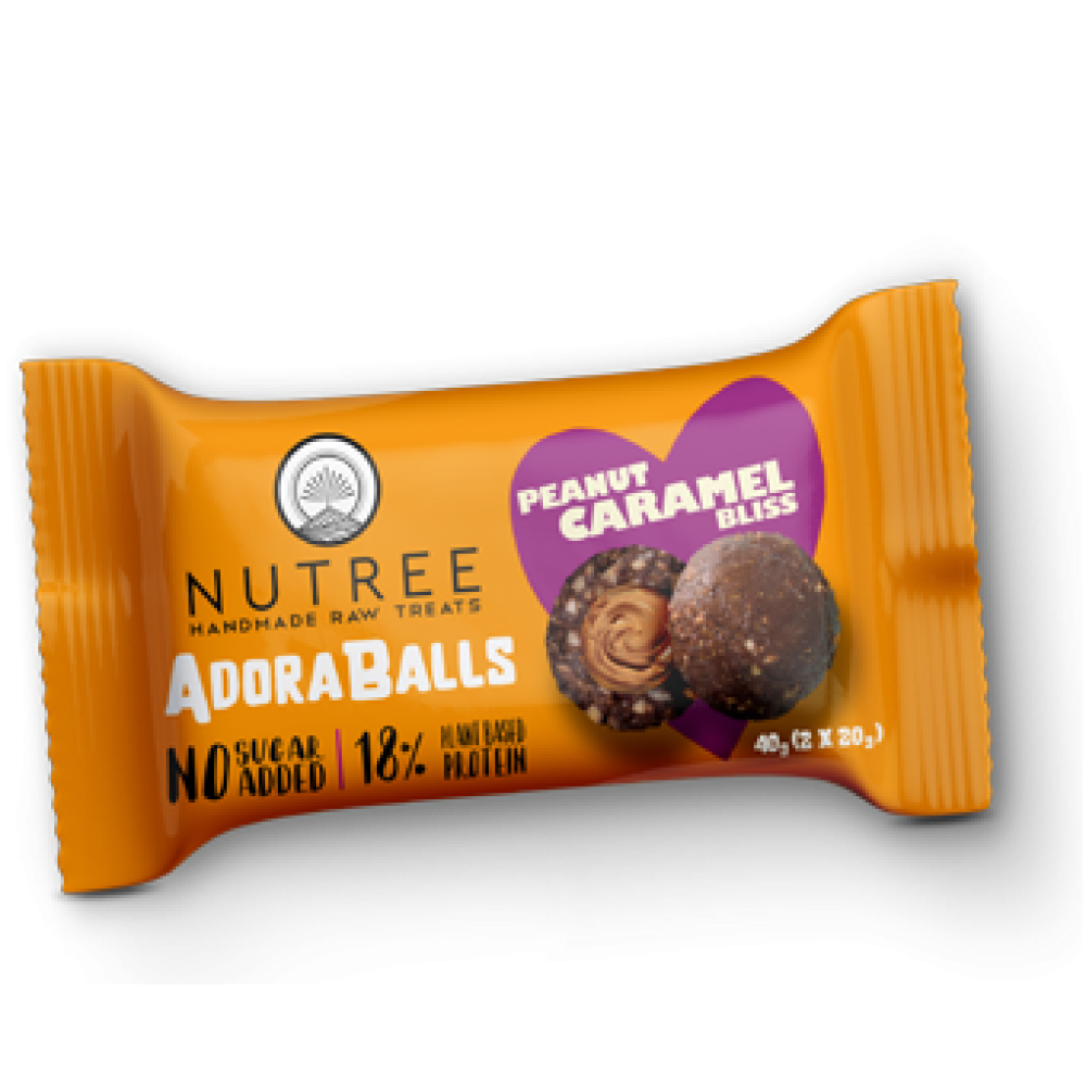 Πρωτεϊνικές μπαλίτσες AdoraΒalls με κρέμα φυστικιού και καραμέλα, χωρίς ζάχαρη και χωρίς γλουτένη 40gr Nutree