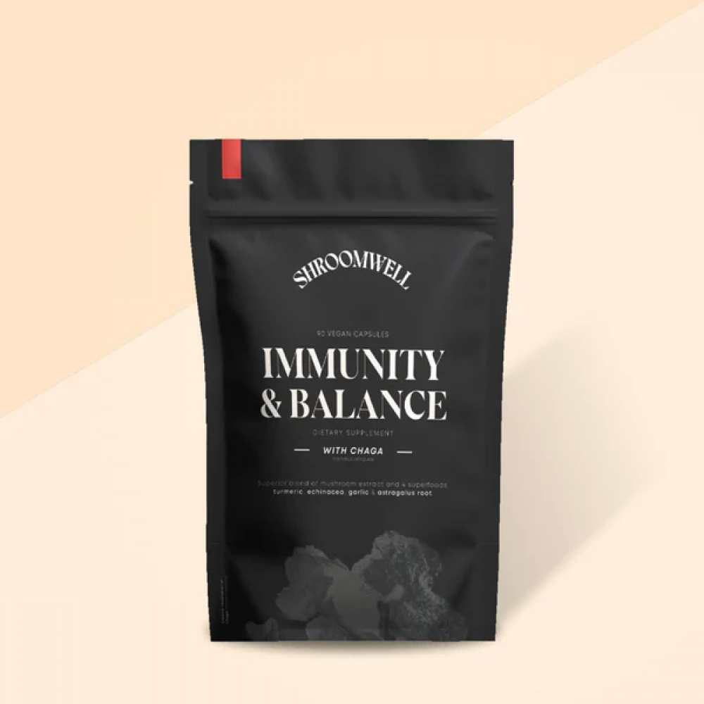 Συμπλήρωμα διατροφής IMMUNITY & BALANCE για ανοσοποιητικό και νοητική ισορροπία με εκχύλισμα μανιταριού CHAGA και εκχυλίσματα super foods Turmeric Echinacea Garlic & Astragalus 90 vegan caps SHROOMWELL