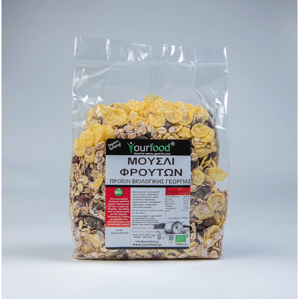 Βιολογικό μούσλι από Νιφάδες βρώμης, σταριού και εξαιρετικά φρούτα. Συνοδέψτε το με γάλα, γιαούρτι, ροφήματα σόγιας, χυμούς. Τέλειο γευστικό πρωινό και ελαφρύ γεύμα. Τα βιολογικά προϊόντα συνιστούν μια πολύ σημαντική διατροφική επιλογή, έχουν θρεπτικά συστατικά, είναι εύγευστα και διατηρούν τη γεύση τους αναλλοίωτη και ωφελούν σημαντικά την υγεία μας.