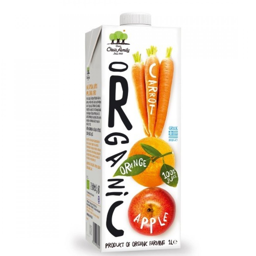 100% πιστοποιημένος βιολογικός χυμός από μήλο, πορτοκάλι και καρότο χωρίς προσθήκη ζάχαρης, χωρίς πρόσθετα όπως συντηρητικά και χρωστικές.