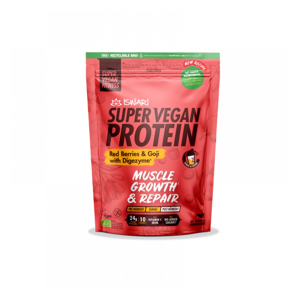 Βιολογικό Μείγμα πρωτεϊνών και υπερτροφών με κόκκινα Μούρα, Γκοτζιμπέρυ και σύμπλεγμα ενζύμων Super Vegan Protein χωρίς Γλουτένη 400gr ISWARI